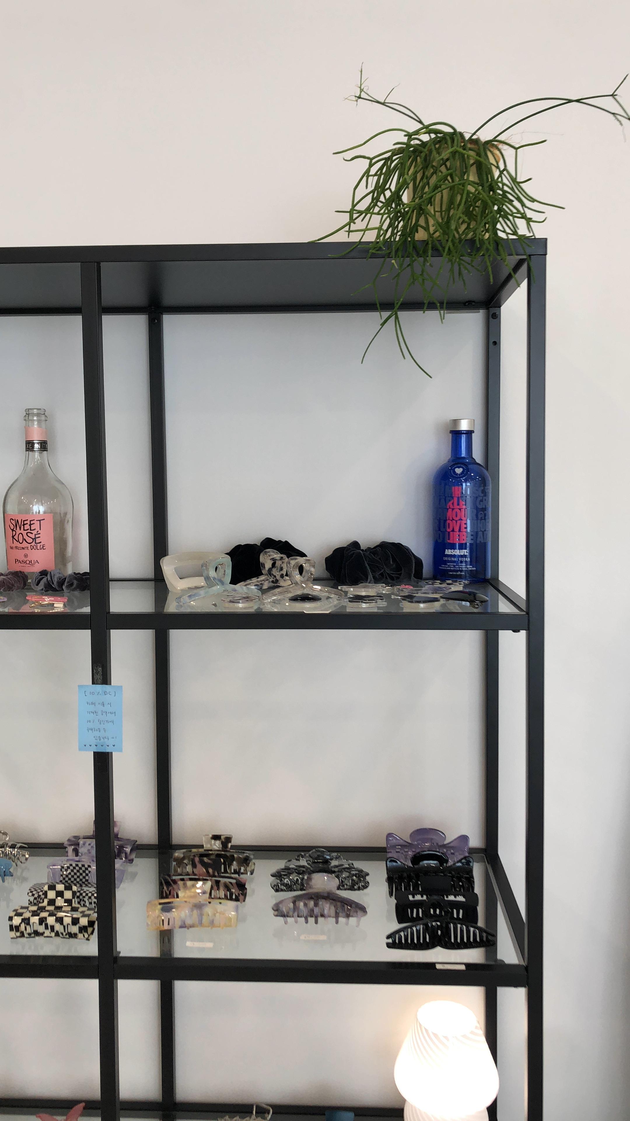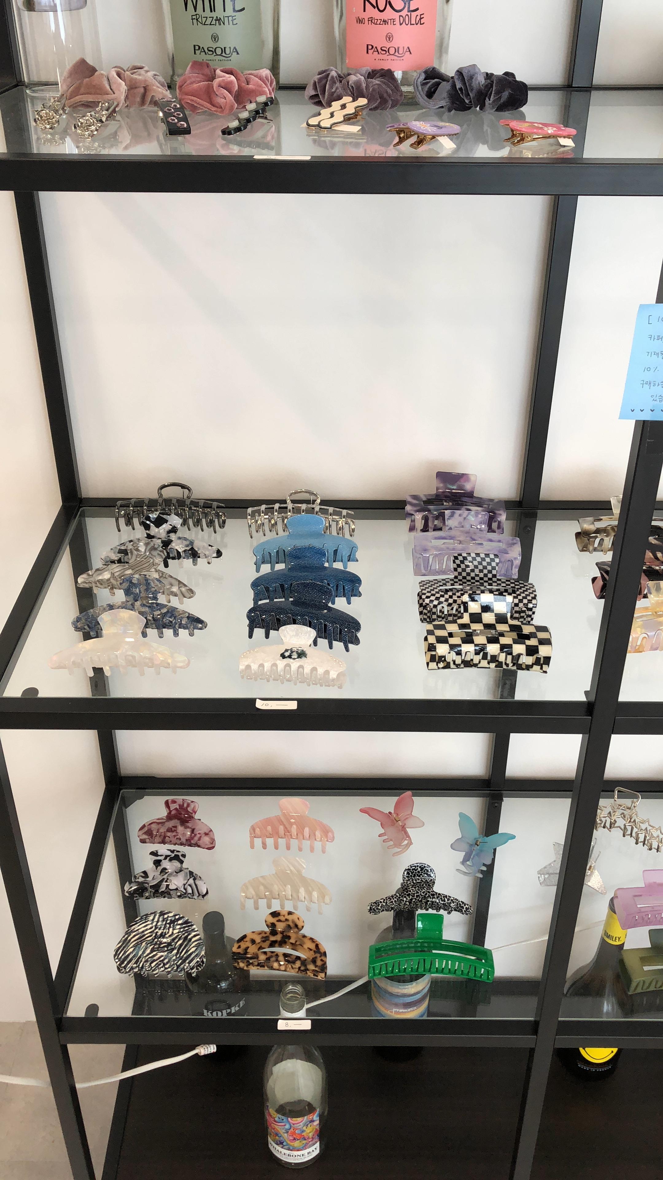 거울 바로 옆 선반에는 머리집게랑 핀, 끈들이 있었는데