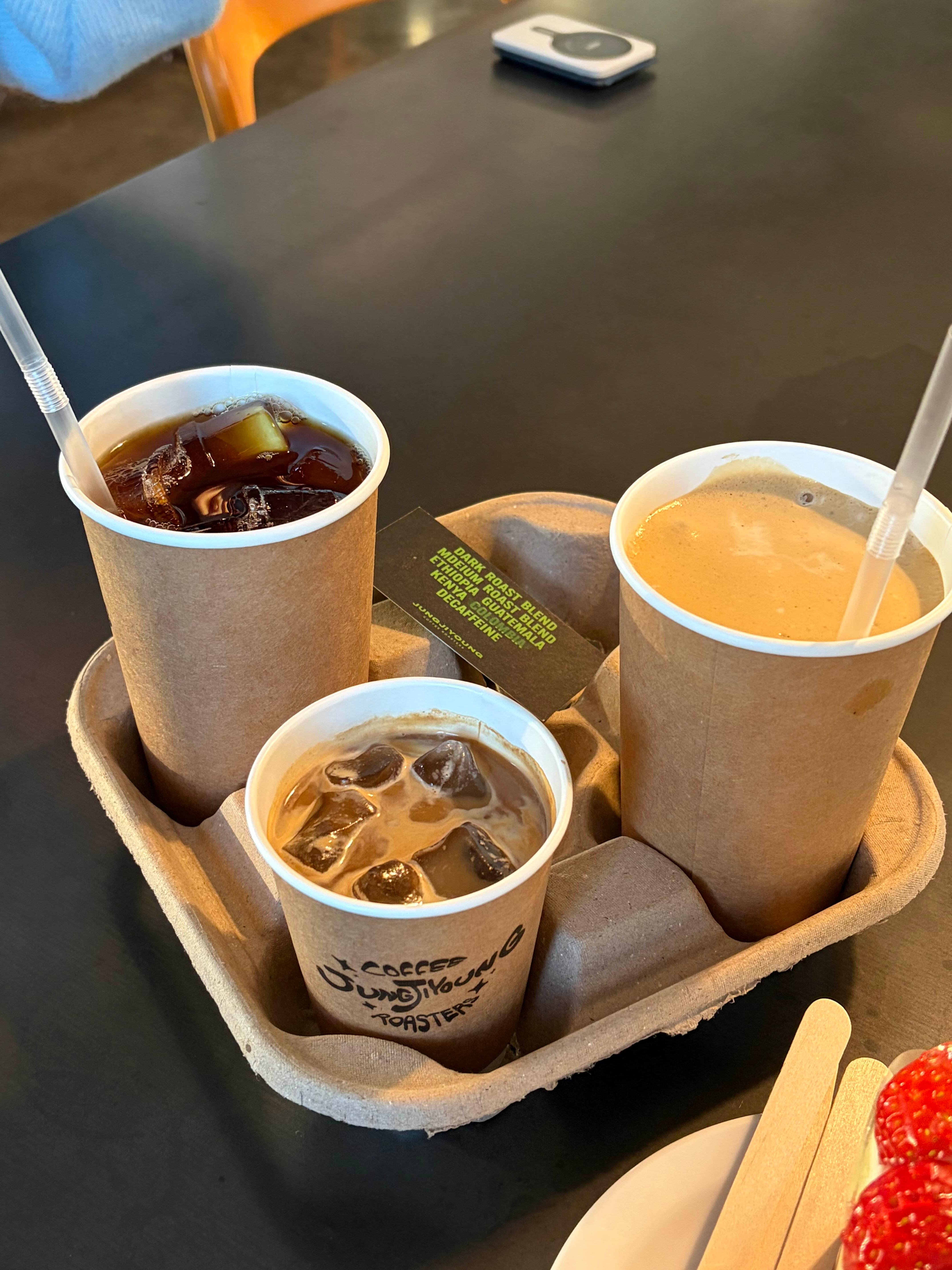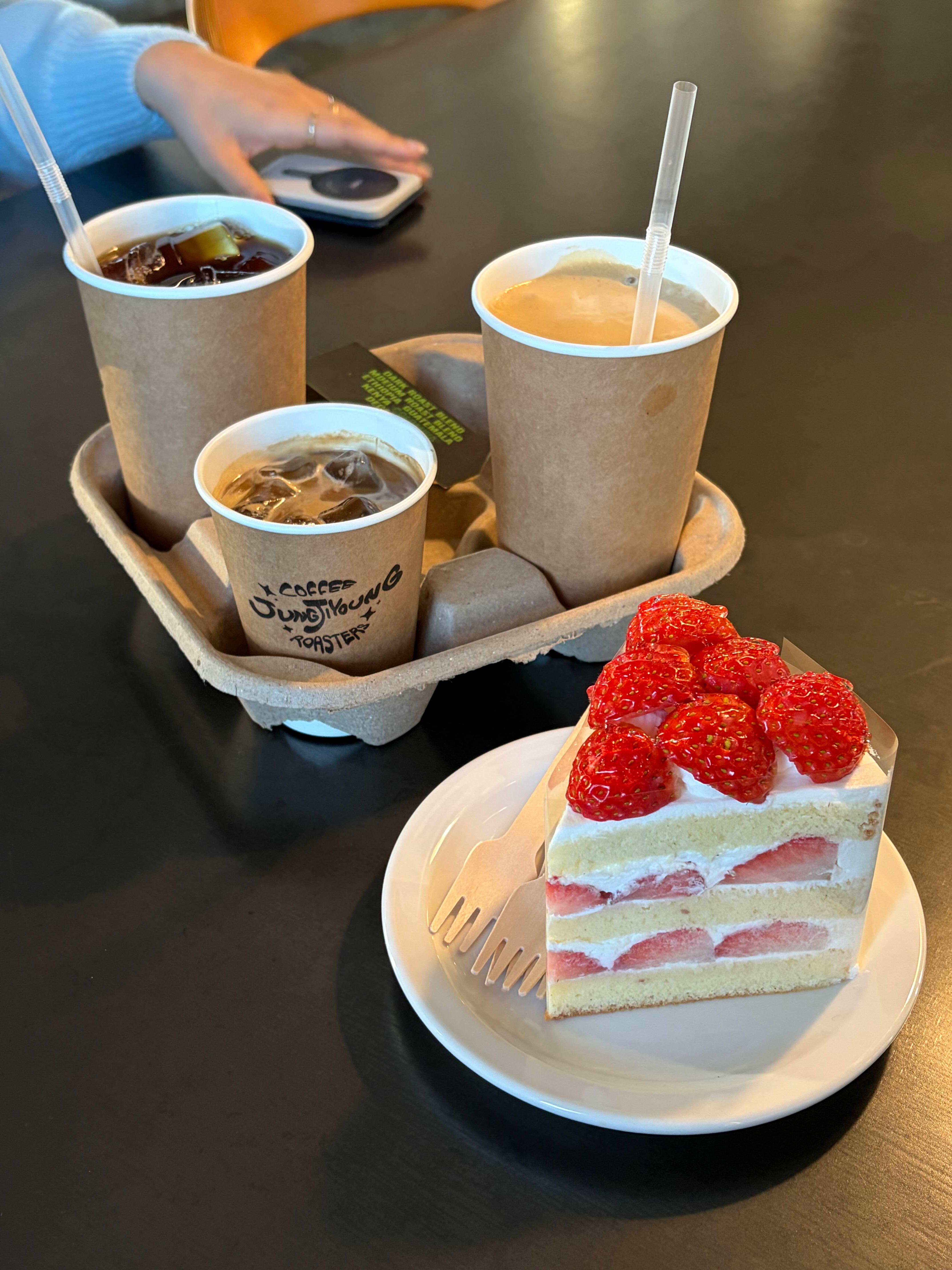 -시그니처 코코넛커피, 콜롬비아 로꼬 멜론 드립커피, 플랫화이트, 딸기 케이크